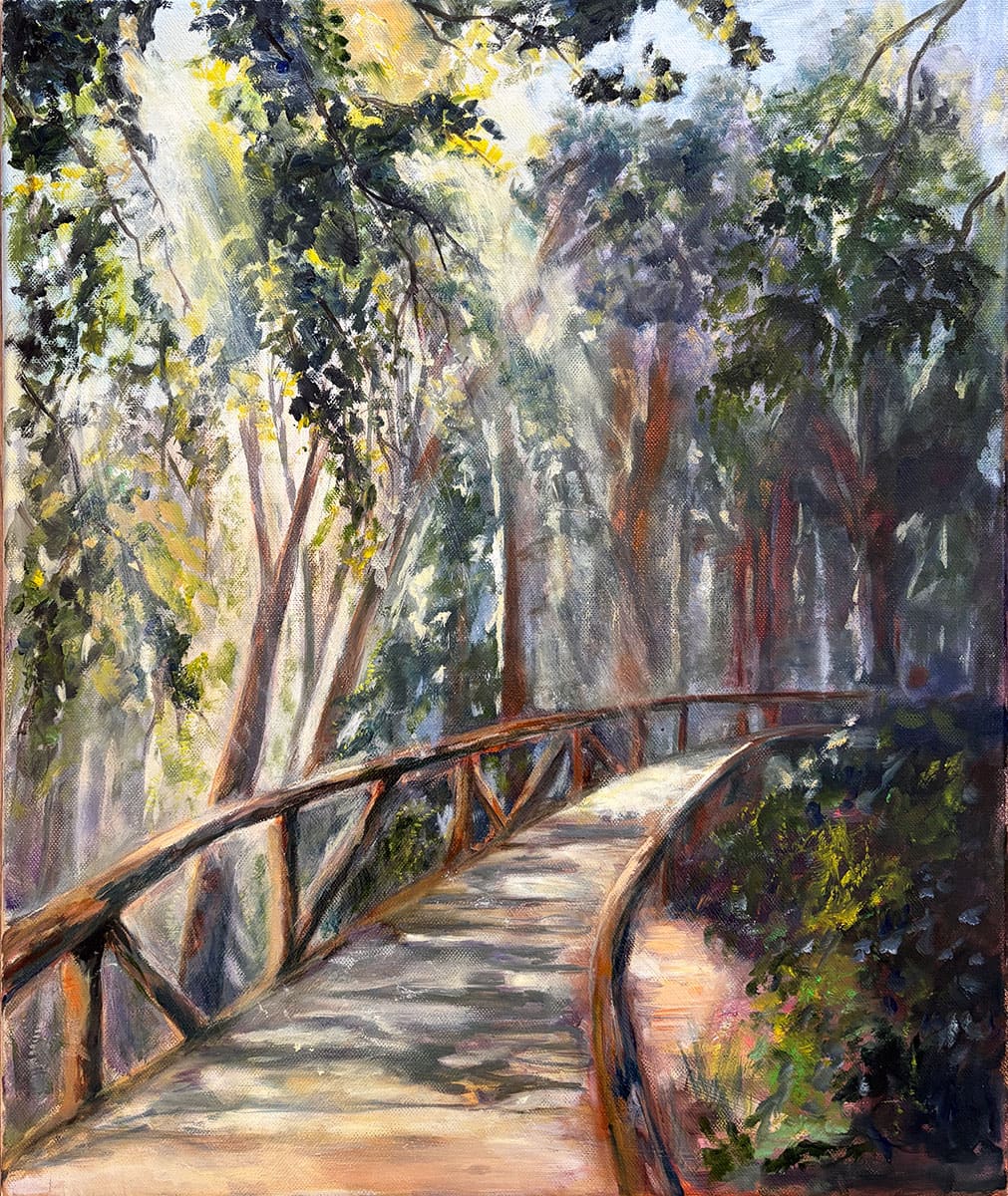 A reggeli fény áttör a lombok között, és meleg foltokat fest a fapadlóra. A sétány csendesen kanyarog az erdő mélye felé, mintha hívná az embert egy elfeledett történet nyomába. A korlátok simára koptak az évek során, és minden görbületük mögött ott van egy régi lépés emléke.